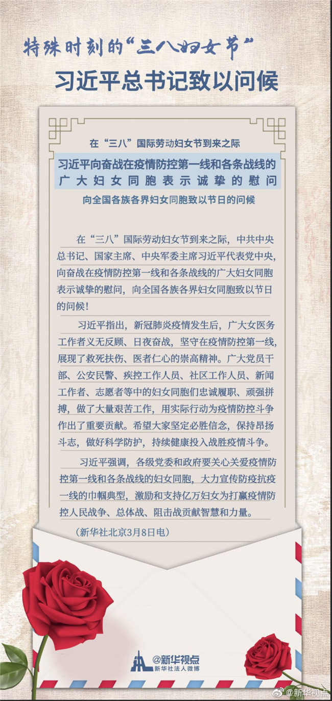 習(xí)近平強(qiáng)調(diào),各級(jí)黨委和政府要關(guān)心關(guān)愛疫情防控第一線和各條戰(zhàn)線的婦女同胞,大力宣傳防疫抗疫一線的巾幗典型,激勵(lì)和支持億萬婦女為打贏疫情防控人民戰(zhàn)爭(zhēng)、總體戰(zhàn)、阻擊戰(zhàn)貢獻(xiàn)智慧和力量。