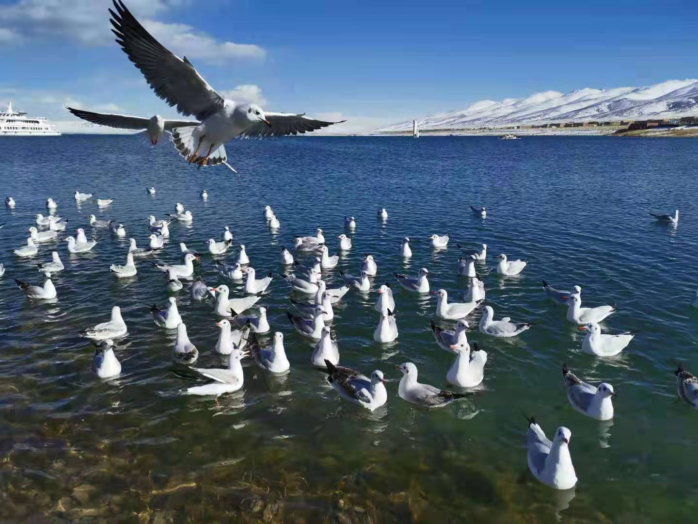 青海湖是中亞—印度、東亞—澳大利亞國際水鳥遷徙的重要節(jié)點和青藏高原水鳥重要的越冬地,水鳥種類95種,占青藏高原水鳥種類的70%,約占全國水鳥種類的33%,每年在青海湖繁殖的斑頭雁、棕頭鷗、漁鷗、普通鸕鶿繁殖種群達(dá)到全球繁殖種群的30%,每年春、秋兩季,途經(jīng)青海湖遷徙停留的水鳥達(dá)10萬余只,其中有11—14種水鳥的種群數(shù)量達(dá)到或超過全球分布種群數(shù)量的1%,每年冬季在青海湖越冬水鳥1萬余只,其中國家Ⅱ級保護(hù)動物大天鵝約1500只。國家Ⅰ級重點保護(hù)動物黑頸鶴在青海湖濕地草甸地帶棲息繁殖。