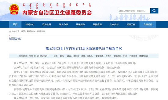 3月28日,記者從內(nèi)蒙古自治區(qū)衛(wèi)生健康委員會(huì)獲悉,截至2020年3月27日24時(shí),內(nèi)蒙古自治區(qū)已連續(xù)38日無新增本土新冠肺炎確診病例、無新增本土新冠肺炎疑似病例。