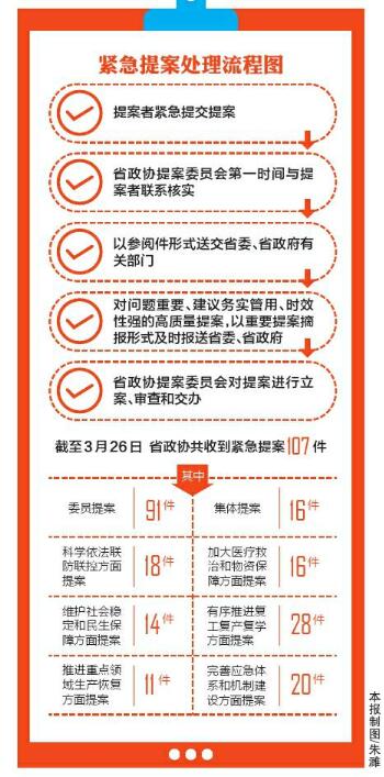 截至3月26日,省政協(xié)共收到關(guān)于新冠肺炎疫情防控及經(jīng)濟社會恢復發(fā)展的緊急提案107件,內(nèi)容涉及依法聯(lián)防聯(lián)控、加大醫(yī)療救治和物資保障、有序復工復產(chǎn)復學、維護社會穩(wěn)定和民生保障、完善應急體系和機制建設(shè)等方面。