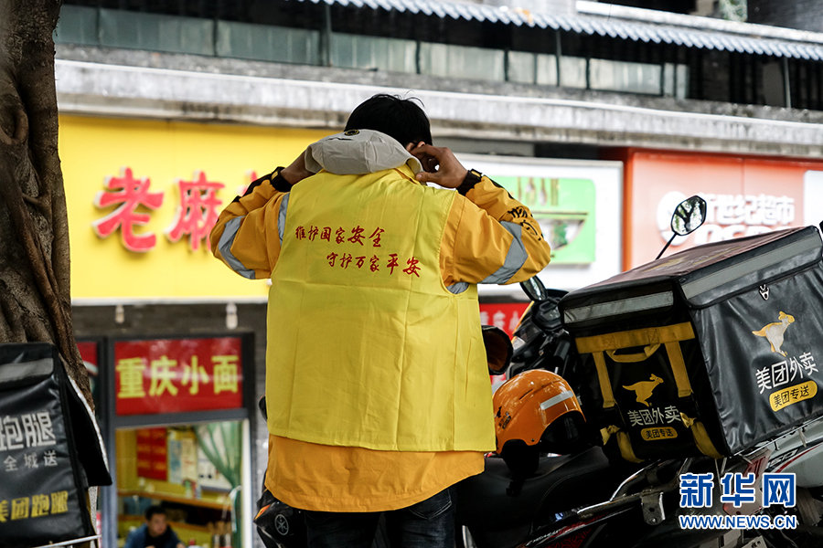 到達(dá)送餐的小區(qū)后,王淞迅速跟對(duì)方取得聯(lián)系,上門進(jìn)行配送。據(jù)沙坪壩區(qū)委政法委相關(guān)負(fù)責(zé)人介紹,通過快遞和外賣配送業(yè)務(wù)來發(fā)送宣傳制品,是為了讓宣傳教育活動(dòng)由人員聚集到分散入戶,變集中宣傳為流動(dòng)宣傳,同時(shí)不降低疫情期間群眾參與度。新華網(wǎng) 韓夢(mèng)霖 攝