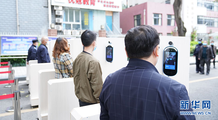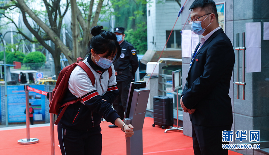 在重慶市第一中學,大校門設(shè)置了多條紅外線成像體溫測控通道,能夠快速檢測到師生體溫并清楚顯示。學生從通道經(jīng)過時,紅外線測溫儀會及時監(jiān)測通過者體溫,若有體溫異常者,設(shè)備會報警。圖為學校老師演習進校場景。新華網(wǎng)發(fā)