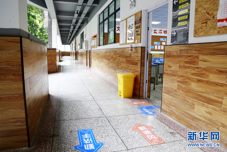 在重慶市第十一中學,為避免人流聚集,在公眾通道處學校設(shè)置了行進方向指示標識以引導師生。新華網(wǎng) 彭博攝