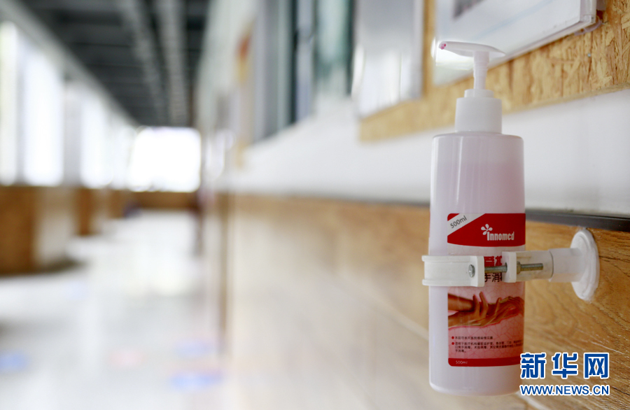 在教室、走廊、寢室等人流密集的場合,重慶市第十一中學配備了免洗消毒液供師生使用。新華網(wǎng) 彭博攝