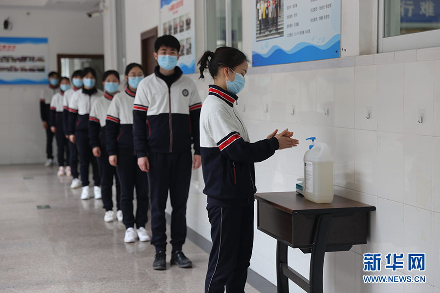 在西南大學附屬中學,上課前學生需提前洗手,在教室外間隔1米左右排隊等待班主任檢查后進入教室上課。班主任將戴好一次性醫(yī)用口罩和一次性手套逐一對學生進行體溫檢查,并做好檢查登記。圖為學生演習進教室環(huán)節(jié)。新華網(wǎng)發(fā)