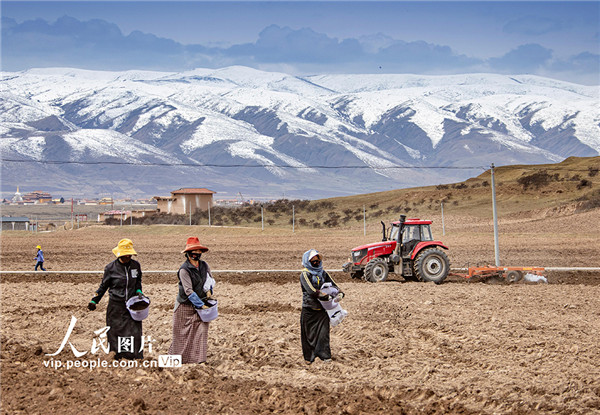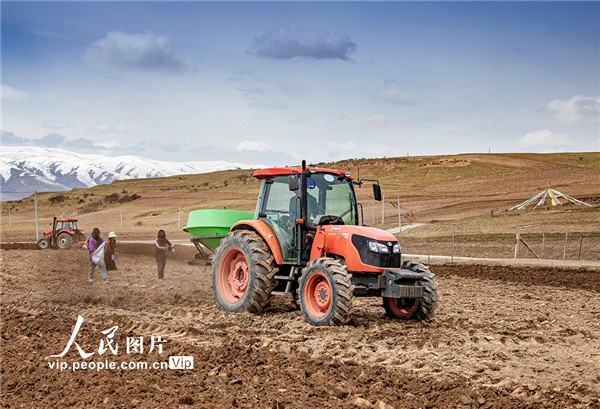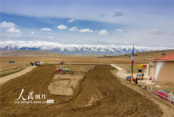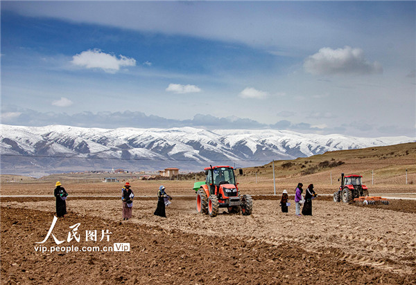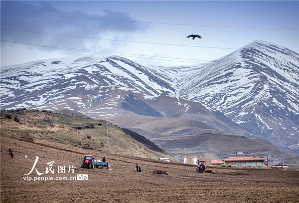 2020年4月26日,四川省阿壩州阿壩縣四洼鄉(xiāng)四洼村,農(nóng)民正在田里忙著耕地施肥,田間地頭呈現(xiàn)一派繁忙景象。劉國興/人民圖片