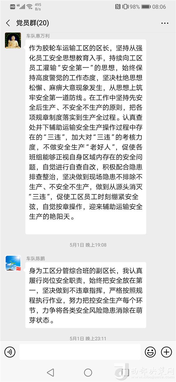 西部決策網(wǎng)訊(記者王瑞鵬 通訊員 張亞濤)為更好地發(fā)揮基層黨支部戰(zhàn)斗堡壘作用、廣大黨員先鋒模范作用,5月份,陜北礦業(yè)檸條塔公司膠輪車運(yùn)輸工區(qū)開展“講安全、抓安全”主題黨日活動(dòng)。該支部按照“全員學(xué)習(xí)、座談?dòng)懻摗⒔Y(jié)合崗位實(shí)際”的學(xué)習(xí)方式,全面深入開展“吸取教訓(xùn)、查擺問題、整改落實(shí)、確保安全”主題黨日活動(dòng)。