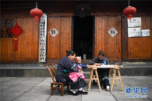 吳美金(右)在十八洞村苗繡特產(chǎn)農(nóng)民專業(yè)合作社繡苗繡(4月24日攝)。1967年出生的吳美金,1992年嫁入飛蟲(chóng)村(現(xiàn)十八洞村飛蟲(chóng)寨)時(shí),只有爛泥路的飛蟲(chóng)村不僅田土少,掙錢活路也少,生活十分困難。2014年,吳美金加入了十八洞村苗繡特產(chǎn)農(nóng)民專業(yè)合作社,從小就會(huì)的苗繡傳統(tǒng)手藝如今成了家庭增收的法寶,不僅在家門口就把錢掙了,同時(shí)還能照顧年幼的孫子孫女。“現(xiàn)在的日子,比年輕的時(shí)候好多了。”吳美金說(shuō)。新華社記者薛宇舸攝
