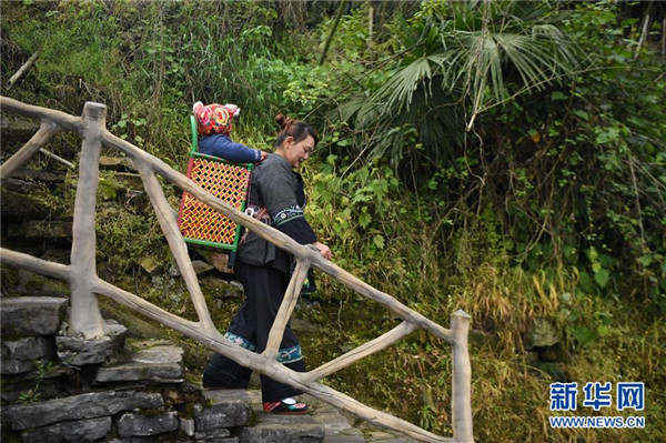 吳美金背著孫子走在十八洞村中,準(zhǔn)備前往村里的苗繡合作社(4月24日攝)。1967年出生的吳美金,1992年嫁入飛蟲(chóng)村(現(xiàn)十八洞村飛蟲(chóng)寨)時(shí),只有爛泥路的飛蟲(chóng)村不僅田土少,掙錢活路也少,生活十分困難。2014年,吳美金加入了十八洞村苗繡特產(chǎn)農(nóng)民專業(yè)合作社,從小就會(huì)的苗繡傳統(tǒng)手藝如今成了家庭增收的法寶,不僅在家門口就把錢掙了,同時(shí)還能照顧年幼的孫子孫女。“現(xiàn)在的日子,比年輕的時(shí)候好多了。”吳美金說(shuō)。新華社記者薛宇舸攝