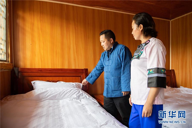 5月15日,在湘西十八洞村,麻輝煌(左)在村民楊慧英家了解民宿建設情況。新華社發(fā)(陳思汗攝)