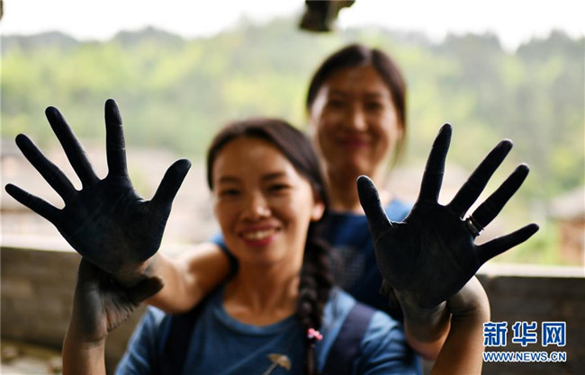 楊成蘭(前)與一名學(xué)徒在展示被植物染料染黑的雙手(5月28日攝)。新華社記者 楊文斌 攝