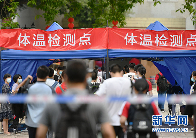 7月7日,在福州第二中學(xué)考點(diǎn),考生進(jìn)入考場前有序通過體溫檢測點(diǎn)。 當(dāng)日,2020年高考拉開帷幕。 新華社記者 魏培全 攝