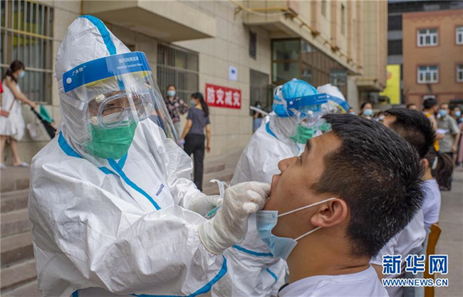 在烏魯木齊市天山區(qū)光明路一社區(qū),醫(yī)護(hù)人員為居民采集咽拭子(7月19日攝)。 新華社記者 胡虎虎 攝
