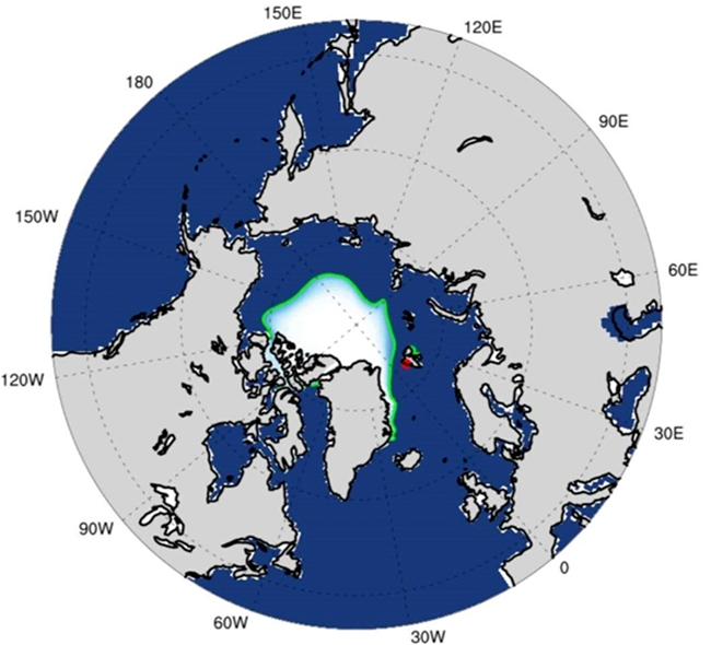 ▲中科院大氣物理研究所ANSO IAP-LASG北極海冰動力集合預測系統(tǒng)6月份發(fā)布的9月份北極海冰范圍預測,綠色實線為預測的北極海冰范圍,白色區(qū)域為海冰區(qū)域。圖片來源:中國科學報