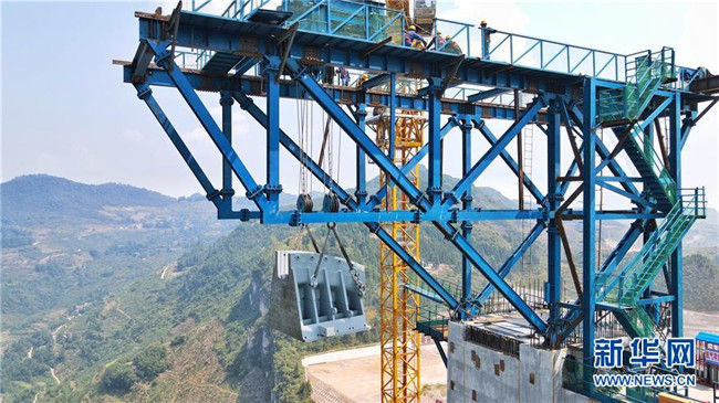9月1日,工作人員在指揮主索鞍吊裝。新華社記者劉續(xù)攝