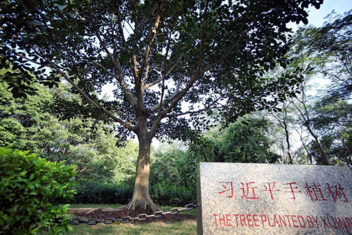 在山頂廣場一片開闊草地上,習(xí)近平揮锨培土、夯實(shí)、澆水,親手植下了一棵高山榕。