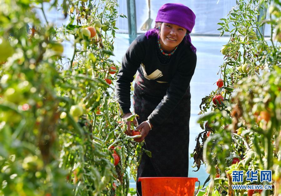 在西藏日喀則白朗國家級蔬菜標準化生產示范區(qū),白朗縣巴扎鄉(xiāng)查吾沖村村民次仁片多在蔬菜大棚里采摘西紅柿(3月2日攝)。新華社記者 張汝鋒 攝
