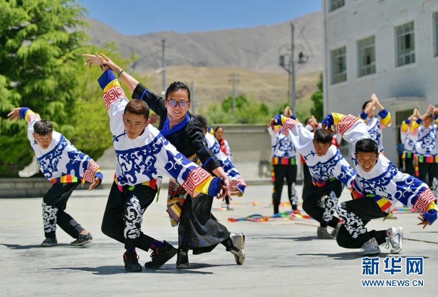 在西藏山南市第一高級中學,來自湖北省武漢市旅游學校的援藏教師馬丹(左三)指導學生練習校園啦啦操(2019年5月8日攝)。新華社記者 張汝鋒 攝