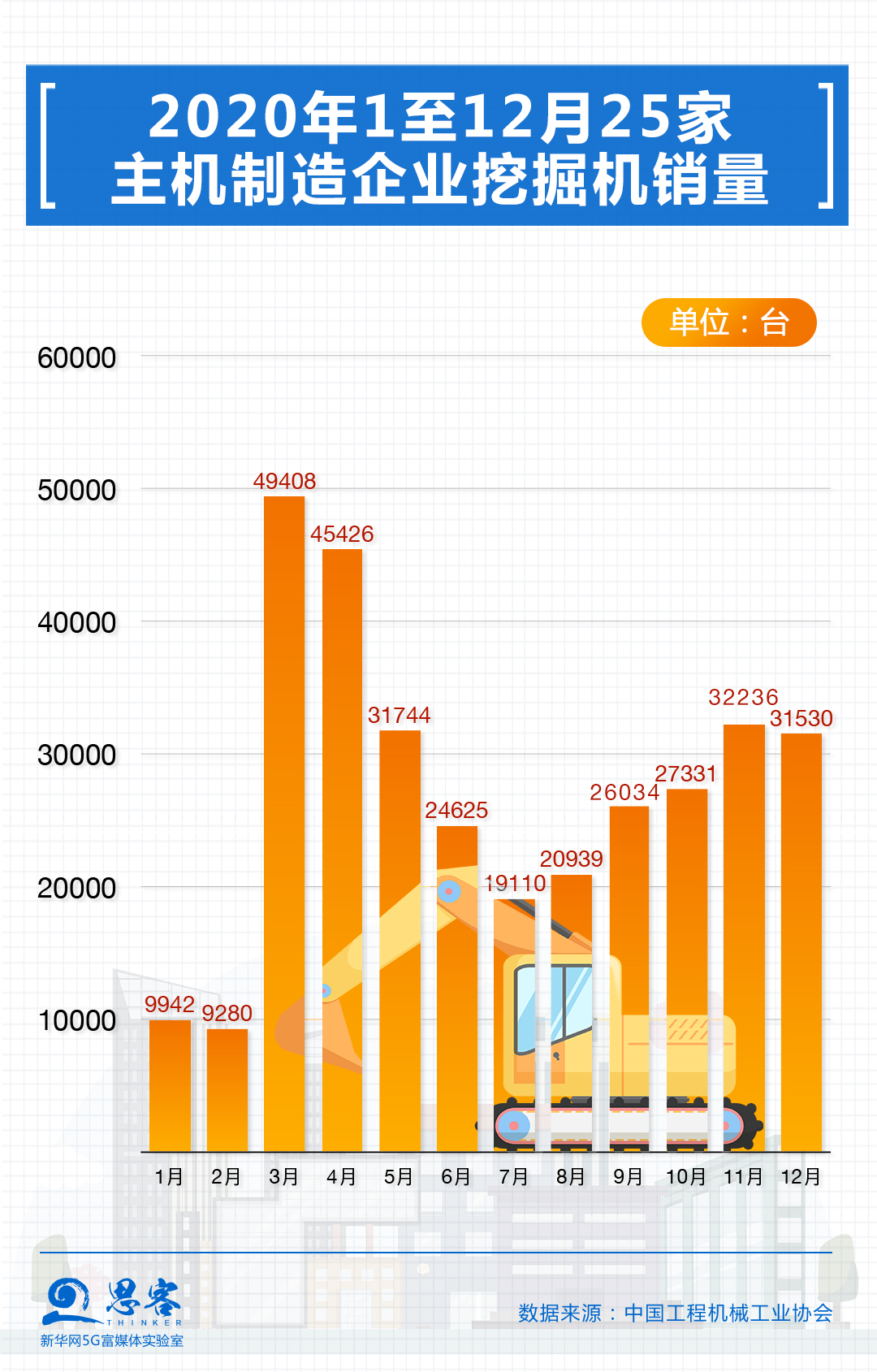 挖掘機(jī)銷量素有中國經(jīng)濟(jì)“溫度計”之稱。據(jù)中國工程機(jī)械工業(yè)協(xié)會統(tǒng)計,2020年12月納入統(tǒng)計的25家挖掘機(jī)制造企業(yè)共銷售各類挖掘機(jī)31530臺,同比增長56.4%;全年共銷售挖掘機(jī)327605臺,同比增長39%。從百萬億里程碑和挖掘機(jī)銷量增長的背后,我們看到了怎樣的中國經(jīng)濟(jì)活力與圖景?