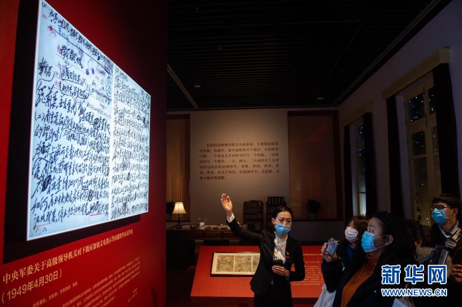 “毛澤東同志香山時(shí)期發(fā)布電報(bào)手稿專(zhuān)題展覽”在北京香山革命紀(jì)念館開(kāi)展,講解員(左一)向媒體記者介紹電報(bào)內(nèi)容(2020年12月16日攝)。新華社記者 陳鐘昊 攝