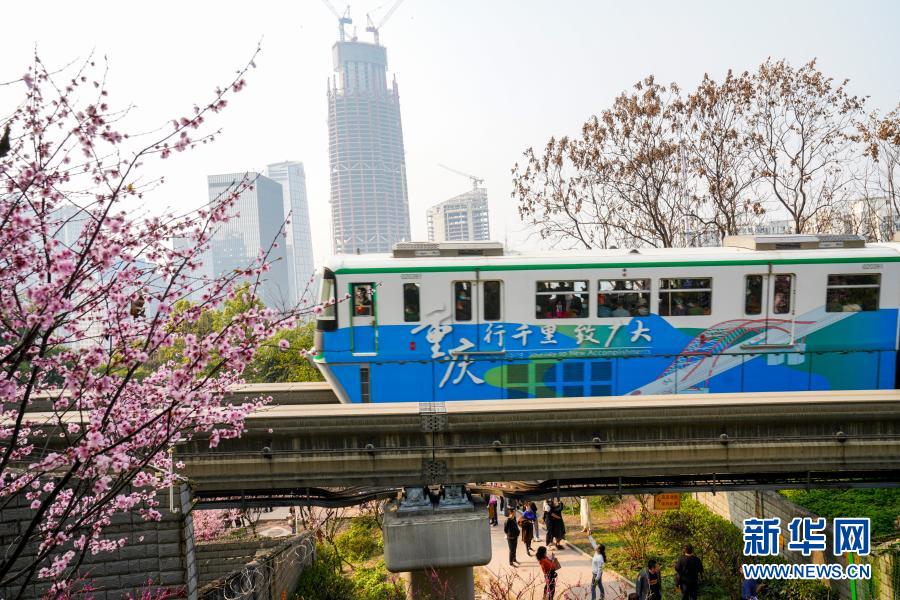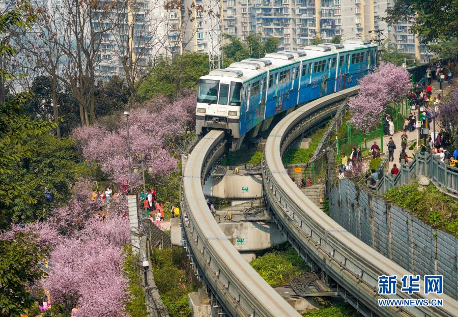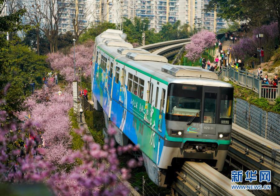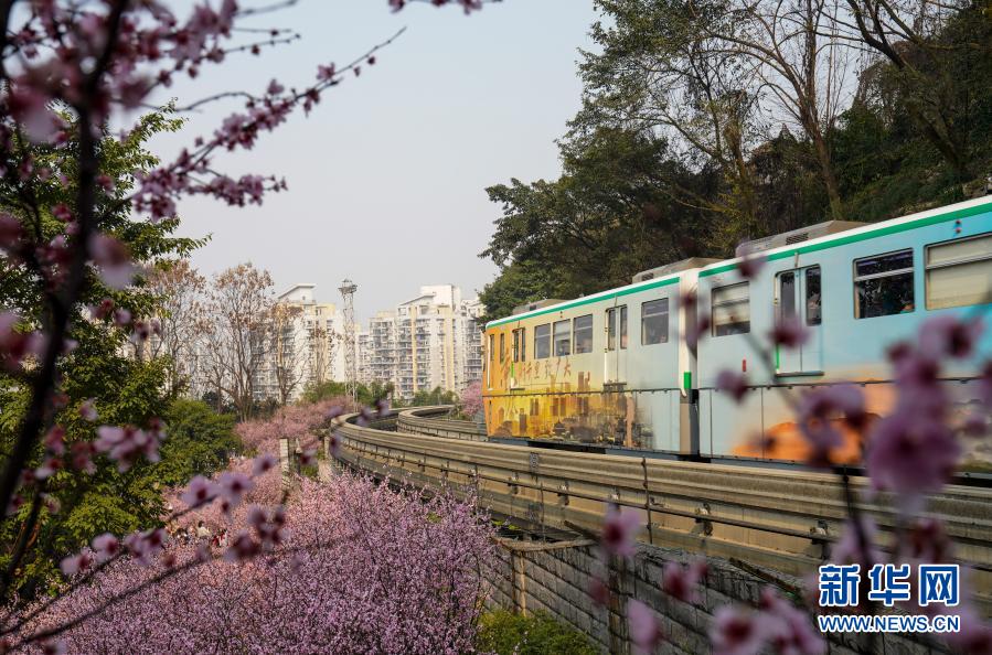 2月23日,在重慶軌道交通2號線佛圖關段,一列單軌列車穿越花海奔馳而過。新華社記者 劉潺 攝