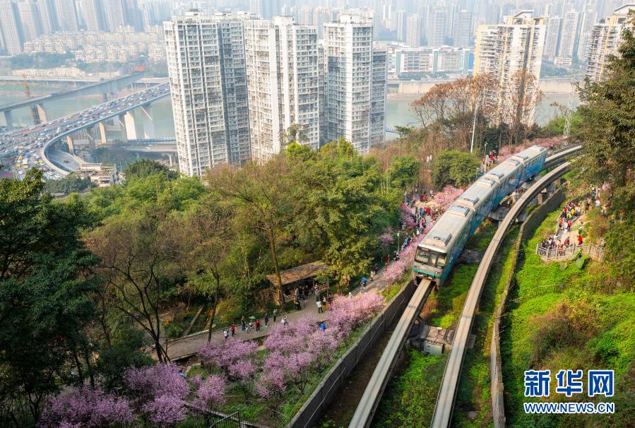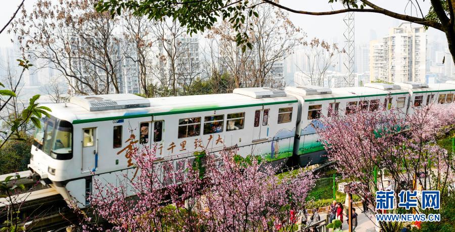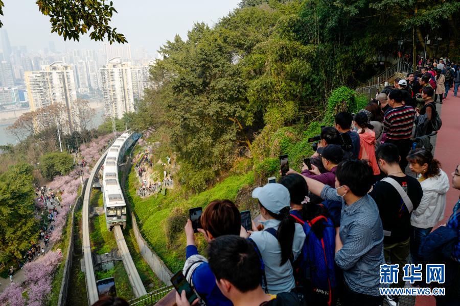 2月23日,在重慶軌道交通2號線佛圖關段,游客在山城步道上拍攝穿越花海的單軌列車。新華社記者 劉潺 攝