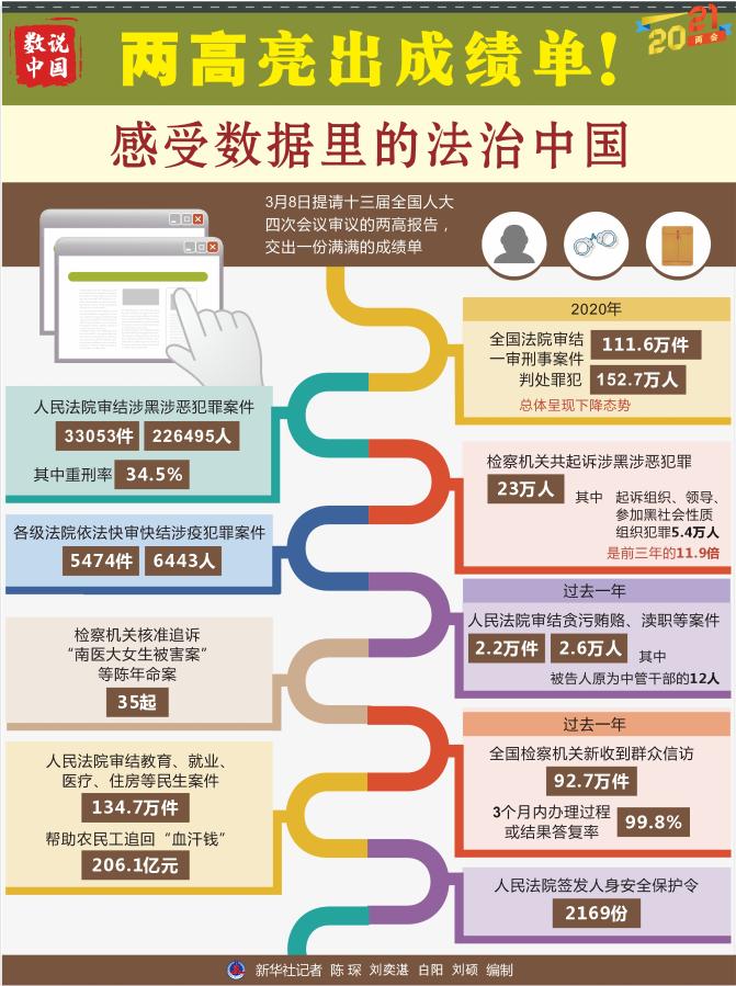 8日提請(qǐng)十三屆全國(guó)人大四次會(huì)議審議的兩高報(bào)告,交出一份滿滿的成績(jī)單。掃黑除惡“打傘破網(wǎng)”、嚴(yán)懲腐敗守護(hù)平安、加強(qiáng)民生司法保障……一串串?dāng)?shù)字勾勒出法治中國(guó)建設(shè)的亮點(diǎn)。