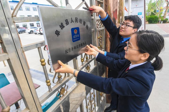 2019年4月23日,河北省阜城縣人民檢察院檢察官在一家企業(yè)門口掛“民營企業(yè)法律服務(wù)站”的牌子,為經(jīng)濟發(fā)展履行保駕護(hù)航職責(zé)。新華社記者李曉果攝