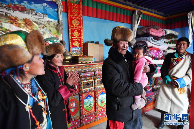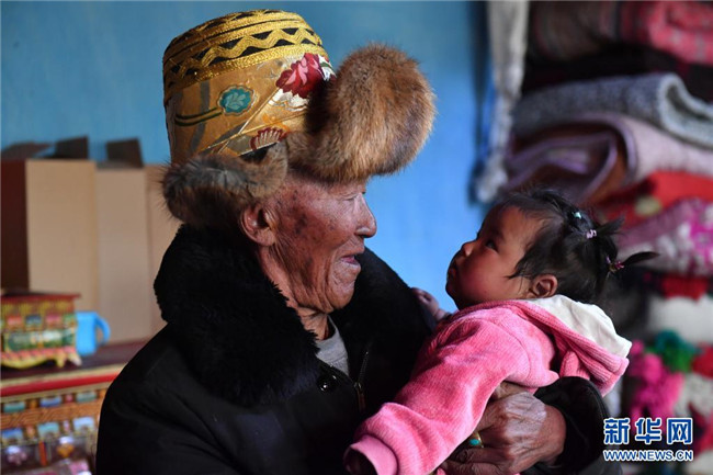 巴桑和九個月大的重外孫女白瑪色珍在一起(3月21日攝)。新華社記者 孫瑞博 攝