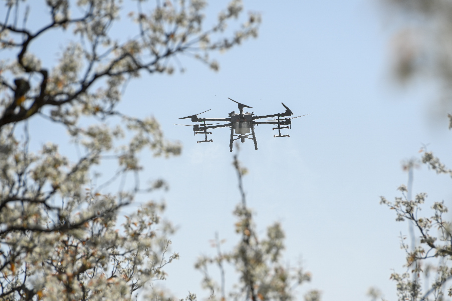 在新疆南疆等地,梨樹花期很短,且往往伴隨沙塵天氣,梨樹授粉作為梨產(chǎn)業(yè)發(fā)展中最為關(guān)鍵的一環(huán),以往通過人工授粉或者蜜蜂授粉進(jìn)行。隨著人工成本不斷增加以及產(chǎn)業(yè)健康發(fā)展需要,以蜜蜂采集的高活性授粉用花粉聯(lián)合無人機(jī)噴施的蜂機(jī)協(xié)同作業(yè)高效液體授粉技術(shù)開始出現(xiàn)。