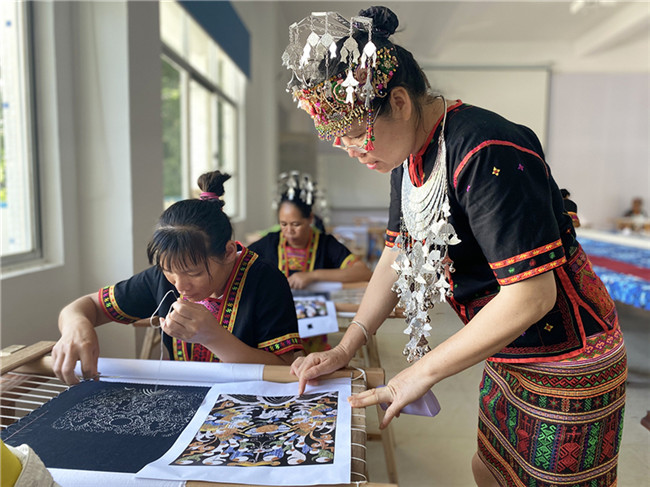 在技藝恢復(fù)的過程中,郭凱的團(tuán)隊(duì)也有意外的收獲。通過對三聯(lián)幅、五聯(lián)幅龍被的復(fù)制,恢復(fù)傳統(tǒng)龍被織造技藝,對黎錦傳統(tǒng)技藝的傳承與發(fā)展具有重要意義;通過對龍被的原材料使用和織造技藝(包括紡染織繡各項(xiàng)技藝)過程編輯形成圖文資料,拍攝形成影像資料,為龍被技藝的保護(hù)、傳承與發(fā)展留下了寶貴的資料和傳播素材;通過開辦龍被刺繡技能培訓(xùn)班,培養(yǎng)了一批刺繡人才,使越來越多的人群能夠掌握傳統(tǒng)特色一技之長,繼而產(chǎn)生富有民族特色的經(jīng)濟(jì)效益和社會效益,更大程度地傳承民族技藝,并將其發(fā)揚(yáng)光大。