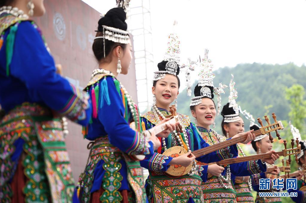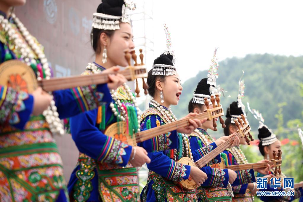 5月16日,演員在丹寨縣萬達小鎮(zhèn)非遺歌舞展演活動上表演侗族琵琶歌。