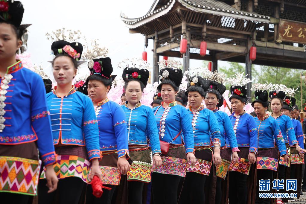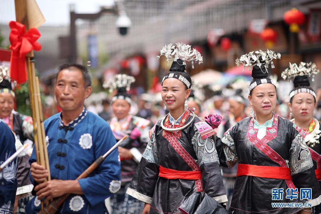 當日,貴州省黔東南苗族侗族自治州丹寨縣萬達小鎮(zhèn)在“第二屆中國丹寨非遺周”中舉辦苗族盛裝巡游、非遺歌舞展演活動。