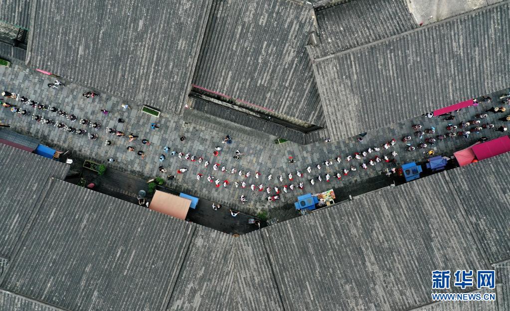 5月16日,身著盛裝的苗族群眾在丹寨萬達小鎮(zhèn)參加服飾展示活動(無人機照片)。