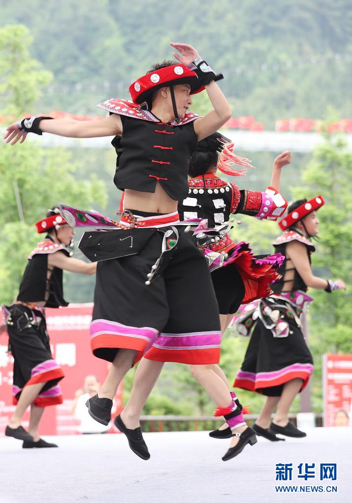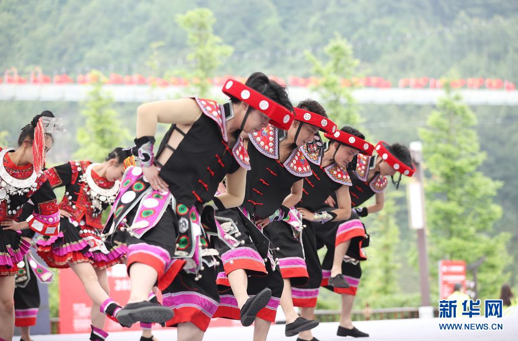 5月16日,演員在丹寨縣萬達小鎮(zhèn)非遺歌舞展演活動上表演苗族木鼓舞。新華社發(fā)(黃曉海 攝)