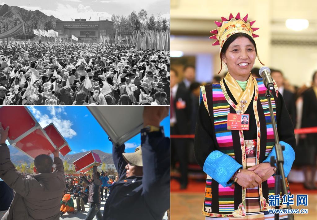 這是一張拼版照片:左上圖為1965年9月9日,拉薩各界各族人民三萬(wàn)多人舉行集會(huì)游行,熱烈慶祝西藏自治區(qū)正式成立(新華社記者馬競(jìng)秋攝);左下圖為拉薩市柳梧新區(qū)管委會(huì)柳梧鄉(xiāng)柳梧村換屆選舉工作人員展示投票箱(2014年10月29日新華社記者普布扎西攝);右圖為2018年3月11日,十三屆全國(guó)人大一次會(huì)議在北京人民大會(huì)堂舉行第三次全體會(huì)議,全國(guó)人大代表卓嘎在“代表通道”接受采訪(新華社記者金立旺攝)。新華社發(fā)