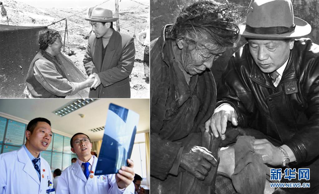 這是一張拼版照片:左上圖為來(lái)自陜西的援藏干部阿里日土縣副縣長(zhǎng)賈冗勇深入牧區(qū),幫助藏族牧民解決生產(chǎn)、生活的實(shí)際困難(新華社記者土登攝 1997年11月11日發(fā));左下圖為2017年8月3日,北京積水潭醫(yī)院援藏醫(yī)生龔曉峰(右)和北京天壇醫(yī)院援藏醫(yī)生李家謀在拉薩市人民醫(yī)院骨科病房?jī)?nèi)查看患者的X光片,進(jìn)行工作交接(新華社記者晉美多吉攝);右圖為孔繁森(右)在阿里日土縣過(guò)巴鄉(xiāng)為孤寡老人益西卓瑪治?。ㄐ氯A社記者土登攝 1994年12月26日發(fā))。新華社發(fā)
