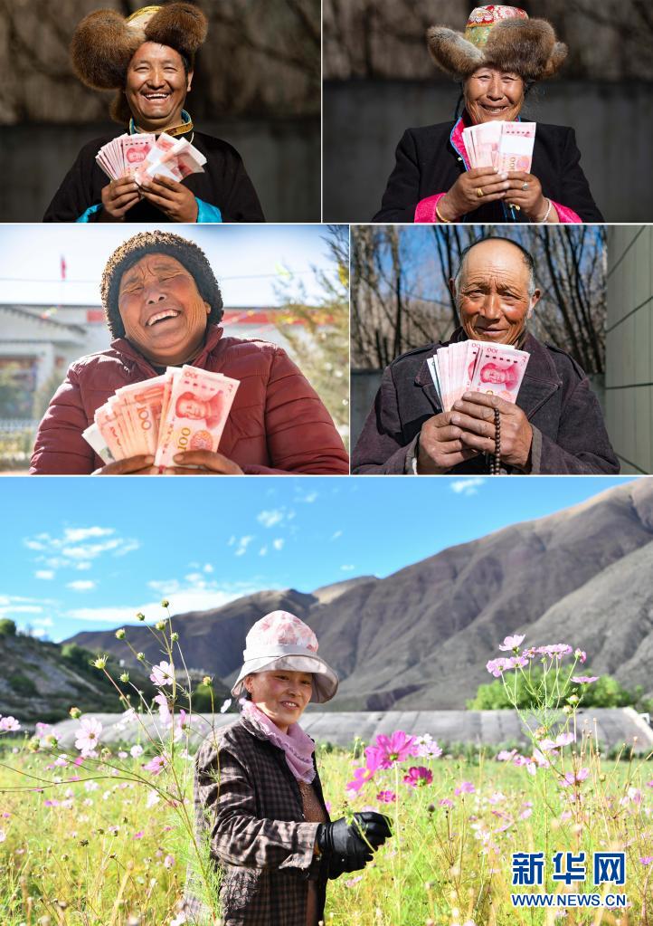 這是一張拼版照片:上四圖為2021年2月9日,山南市乃東區(qū)克松社區(qū)領(lǐng)到分紅的農(nóng)民興高采烈(新華社記者普布扎西攝);下圖為西藏昌都市察雅縣卡貢村村民在當(dāng)?shù)孛缙援a(chǎn)業(yè)基地采集鮮花種子,曾經(jīng)的建檔立卡貧困戶(hù)在這里實(shí)現(xiàn)了就業(yè),完成了脫貧(2020年9月28日 新華社記者晉美多吉攝)。新華社發(fā)