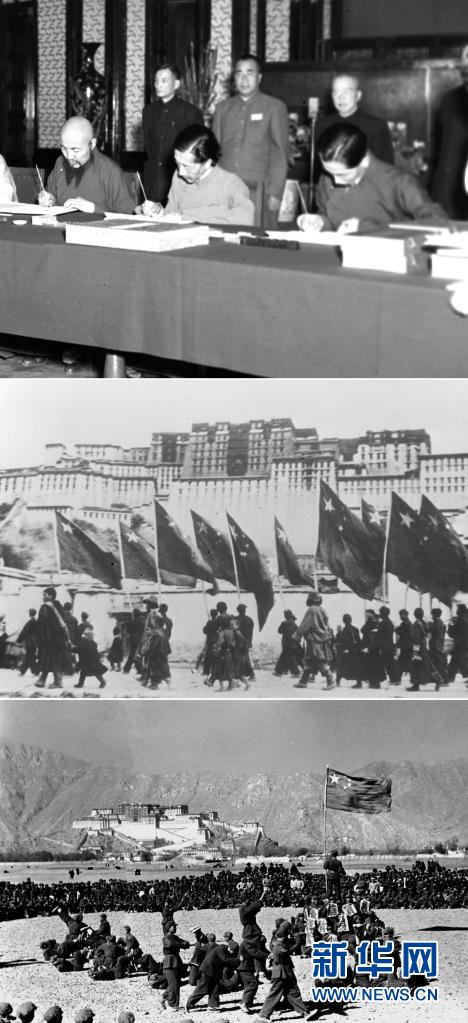 這是一張拼版照片:上圖為1951年5月23日,中央人民政府與西藏地方政府在北京簽訂《關(guān)于和平解放西藏辦法的協(xié)議》(簡(jiǎn)稱(chēng)“十七條協(xié)議”)。上圖為西藏地方政府代表在協(xié)議上簽字;中圖為1951年10月26日,西藏地方政府為人民解放軍舉行了隆重的入城式,拉薩古城飄揚(yáng)著五星紅旗;下圖為西藏和平解放后,人民解放軍與藏族群眾在布達(dá)拉宮前歡度新年。