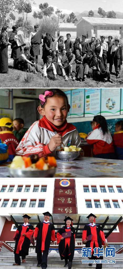 這是一張拼版照片:上圖為拉薩中學(xué)的應(yīng)屆畢業(yè)生在校園里練歌,準(zhǔn)備參加畢業(yè)典禮(新華社記者任用昭攝);中圖為一名藏族女孩在西藏雙湖縣嘎措鄉(xiāng)小學(xué)內(nèi)享受“三包”(包吃、包住、包學(xué)習(xí)費(fèi)用)政策(2014年6月29日新華社記者普布扎西攝);下圖為2017年11月10日,西藏大學(xué)舉行首屆博士研究生畢業(yè)典禮,向4名畢業(yè)生授予博士學(xué)位。這4名博士分別來(lái)自藏族歷史專(zhuān)業(yè)、藏語(yǔ)言文學(xué)專(zhuān)業(yè)及高原醫(yī)學(xué)專(zhuān)業(yè)(新華社記者覺(jué)果攝)。新華社發(fā)