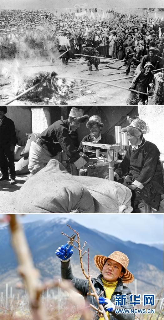 這是一張拼版照片:上圖為1959年8月,西藏墨竹工卡縣的翻身農(nóng)奴焚燒三大領(lǐng)主的剝削文契(新華社發(fā));中圖為1984年,江孜縣農(nóng)民洛桑旺堆(左)向國(guó)家出售余糧。他家承包土地100多畝,農(nóng)忙種地,農(nóng)閑搞建筑、跑運(yùn)輸(新華社記者土登攝);下圖為2020年3月22日,西藏林芝現(xiàn)代蘋(píng)果標(biāo)準(zhǔn)化示范園的工作人員為桃樹(shù)剪枝。該示范園實(shí)施農(nóng)機(jī)農(nóng)藝結(jié)合、水肥一體化及“果草畜循環(huán)”,大面積推廣蘋(píng)果矮砧集約高效栽培技術(shù),帶動(dòng)米林縣羌納鄉(xiāng)林巴、才巴、色沃村及附近的農(nóng)戶(hù)增收(新華社記者 張汝鋒 攝)。新華社發(fā)