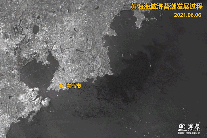 ▲圖為SAR衛(wèi)星拍攝的黃海海域時(shí)序動(dòng)態(tài)圖,可以清晰地看到滸苔潮發(fā)展的過(guò)程。