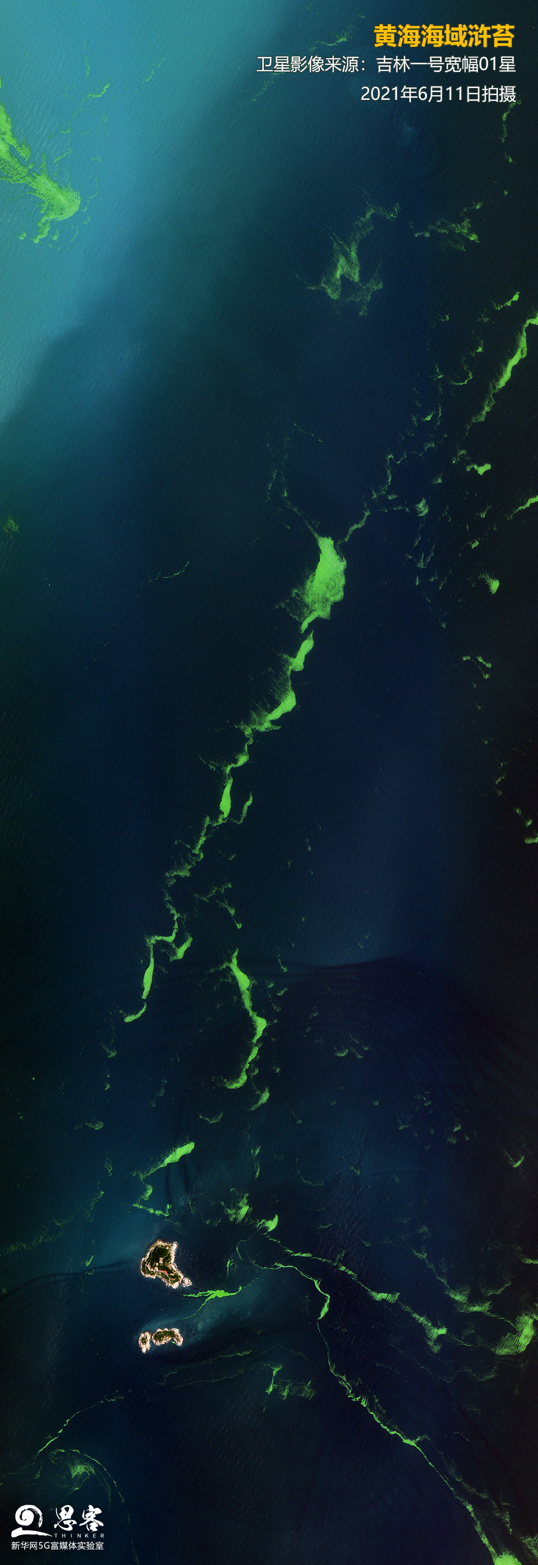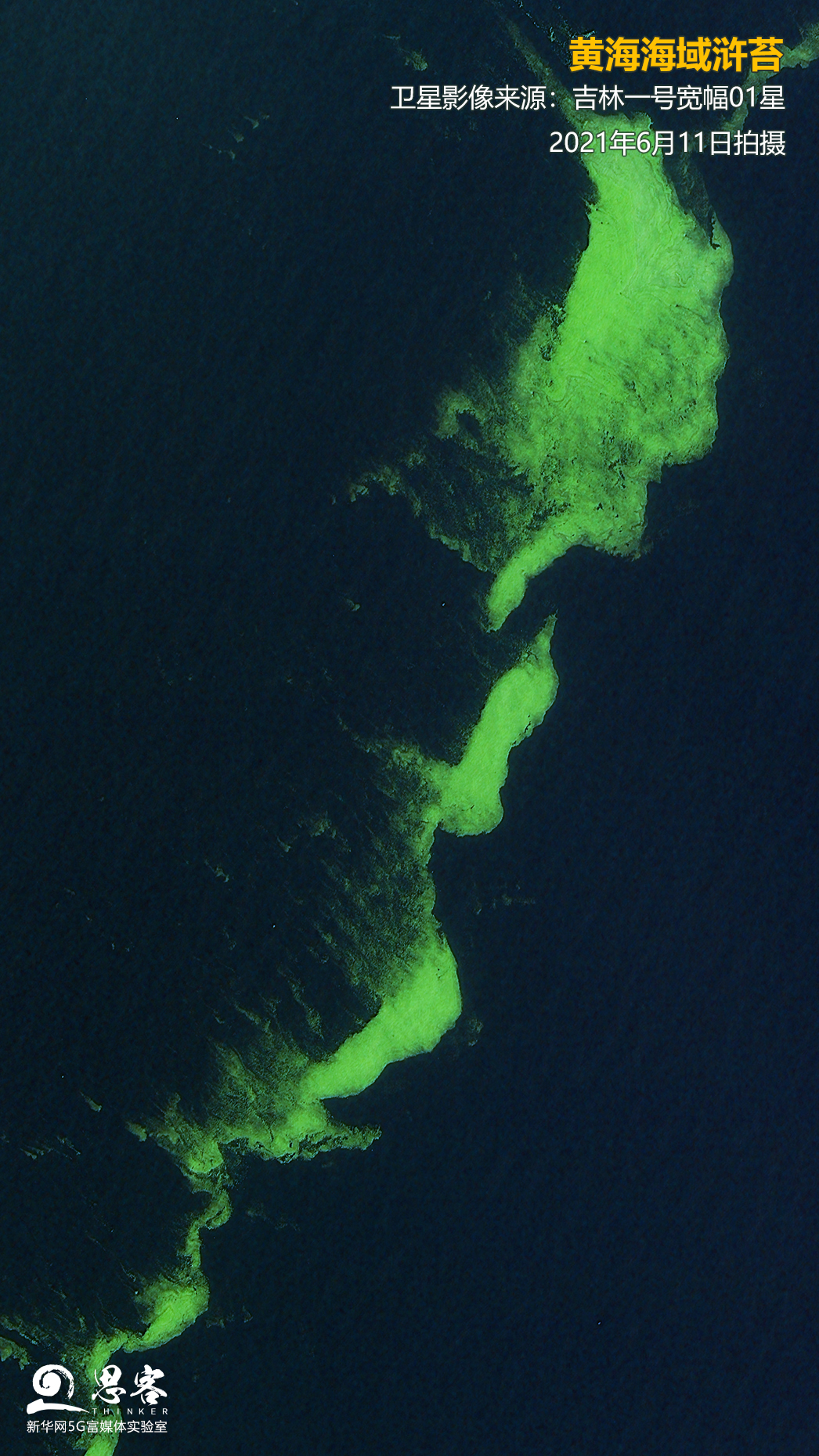 ▲圖為吉林一號(hào)寬幅01星2021年6月11日拍攝的黃海海域滸苔。