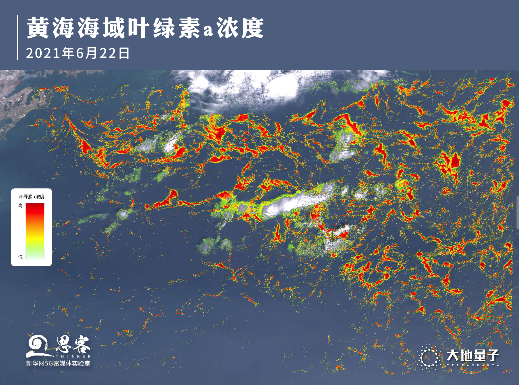 ▲基于遙感影像反演技術(shù)得到的黃海海域葉綠色a濃度遙感分析,由此可推出滸苔生長(zhǎng)較旺盛。制圖:大地量子