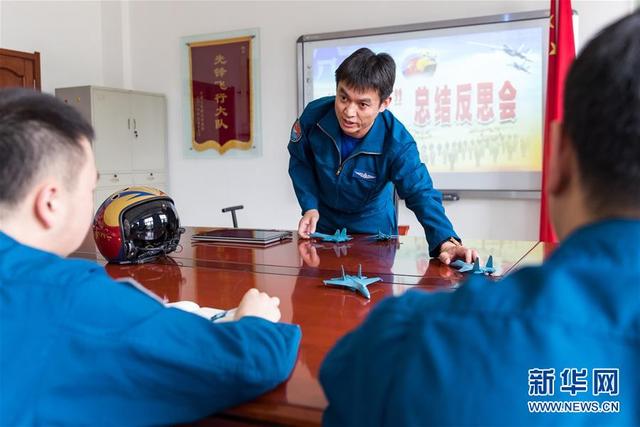 空軍航空兵某旅副參謀長(zhǎng)姚凱(中)在大隊(duì)講評(píng)室給年輕飛行員講述對(duì)抗空戰(zhàn)比武中的經(jīng)驗(yàn)教訓(xùn)(2018年9月14日攝)。新華社發(fā)(張皓陽 攝)