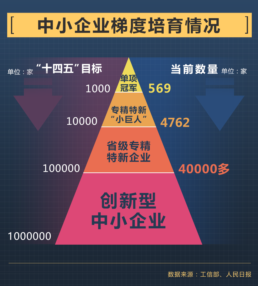 為了強化產(chǎn)業(yè)鏈韌性,工信部正在梯度培育優(yōu)質(zhì)企業(yè)。“十四五”期間,我國將培育1萬家專精特新“小巨人”企業(yè),創(chuàng)新型中小企業(yè)將達到百萬家。“小巨人”是梯度培育體系中,推動中小企業(yè)由小到大、由大到強、由強變優(yōu)的關(guān)鍵交匯點。