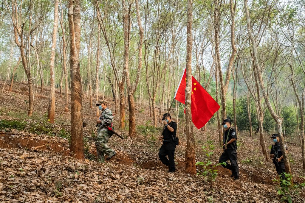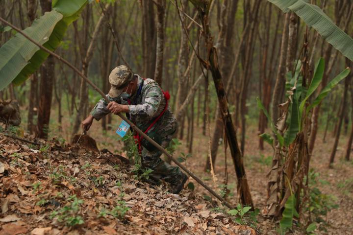 日前,記者跟隨段二文等人,走了一段他認(rèn)為很普通的巡邊路。當(dāng)天,熟悉路況的段二文走在最前面,遇到不好通過的地方,他拿著砍刀幾下就清除了障礙。隨后穿越一片橡膠林,經(jīng)過一條用來區(qū)分國境線的石板路,抵達(dá)最終的目的地——S144-2號界樁。