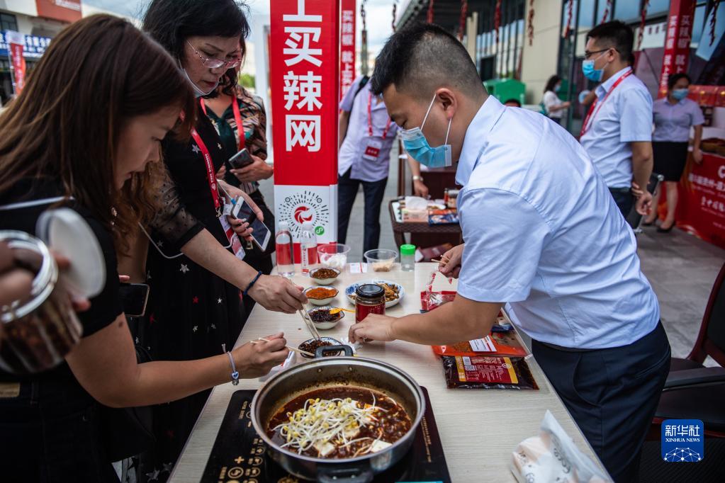 人們?cè)谧窳x市新蒲新區(qū)中國辣椒城品嘗辣椒醬(2020年8月18日攝)。新華社記者 陶亮 攝
