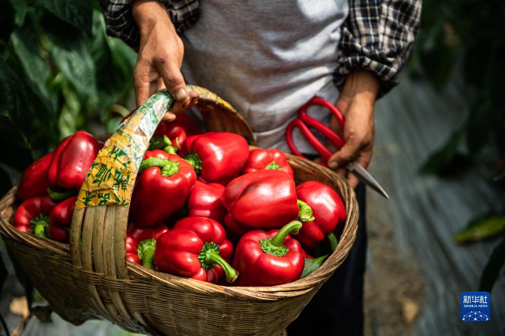 當(dāng)?shù)卮迕裨谫F陽農(nóng)投集團(tuán)花溪蔬菜基地采收的柿子椒(7月30日攝)。新華社記者 陶亮 攝