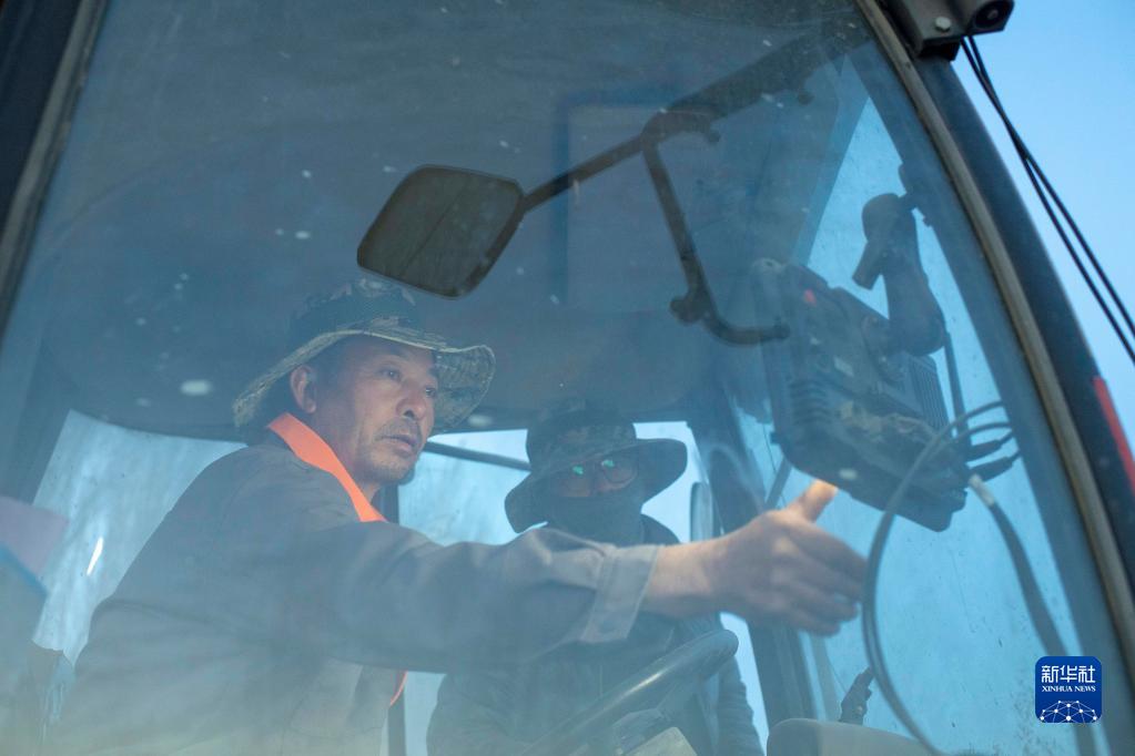 春播時節(jié),陸德文駕駛采棉機在棉田播種,兩名工人在車后跟隨保障,隨時進行壓地膜、補充棉種和處理故障等作業(yè)(4月14日攝)。新華社記者 胡虎虎 攝